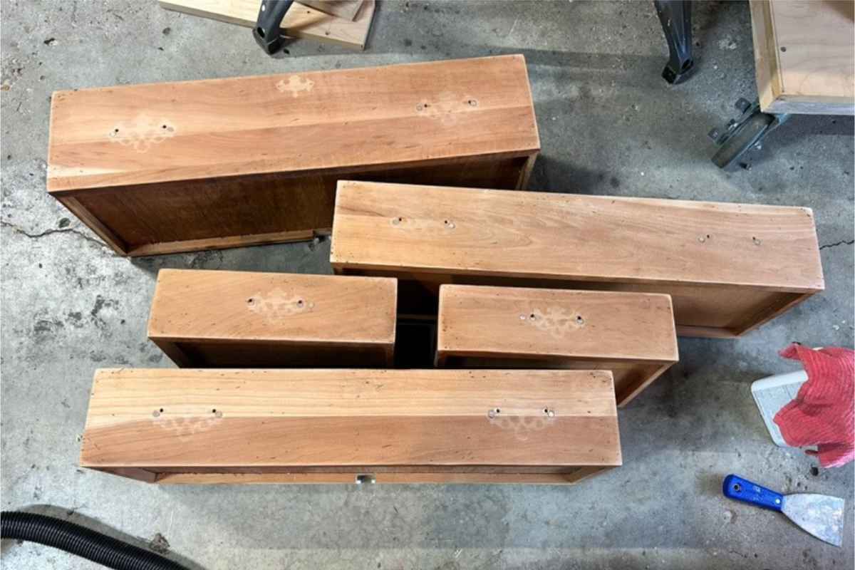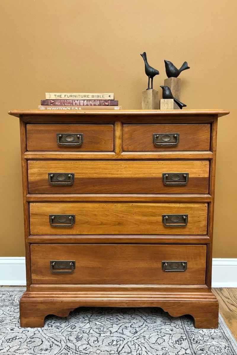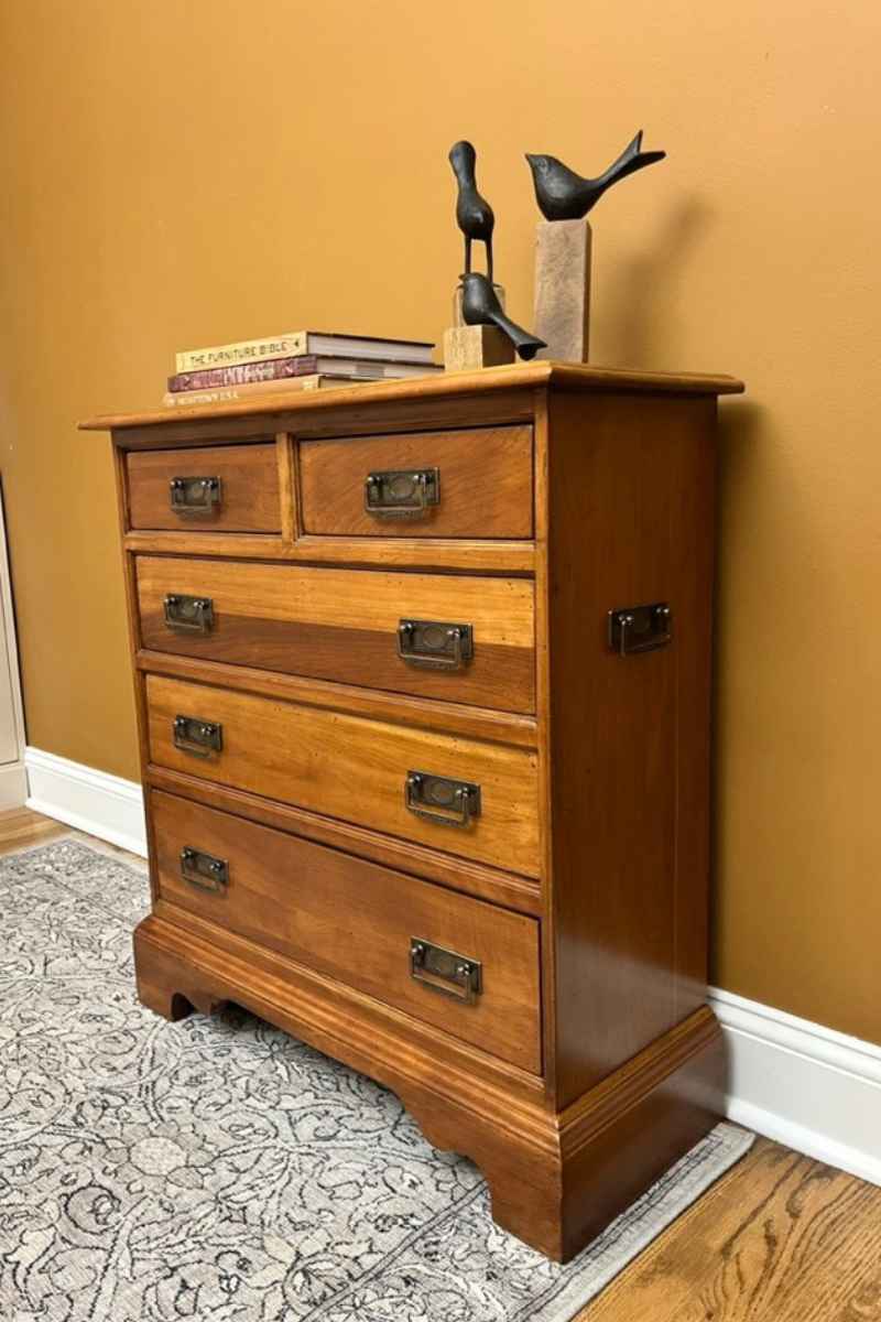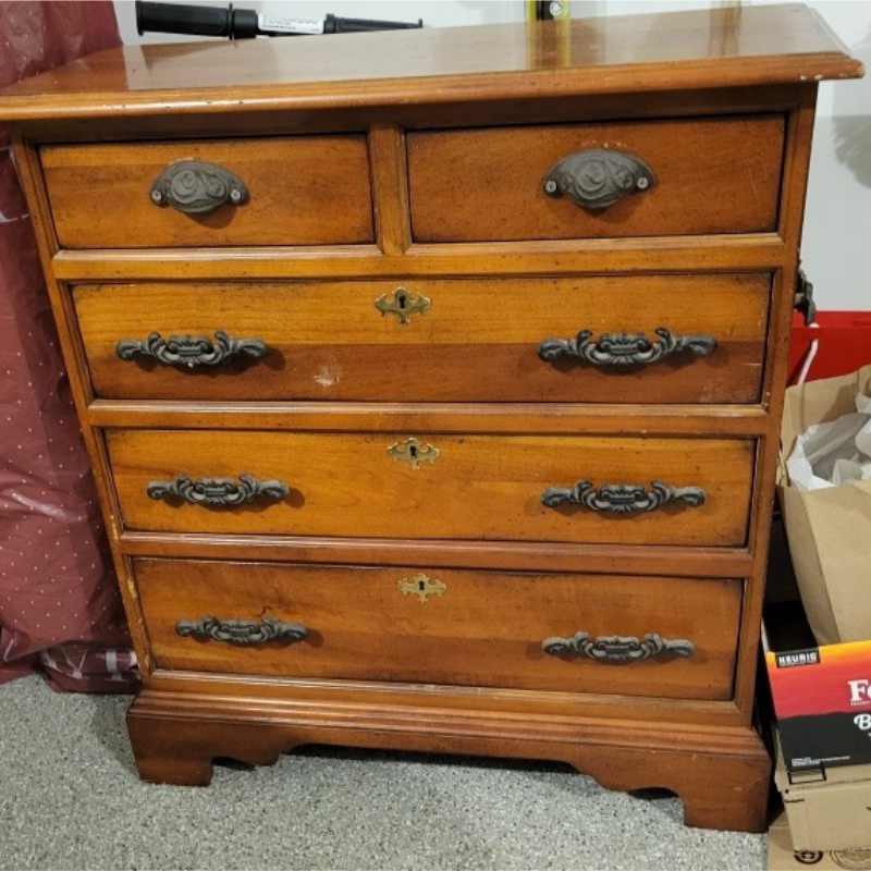 When the original finish was stripped, ghosting appeared where the original hardware had been. That was eliminated in the final finish of the piece. Hardware was also updated.